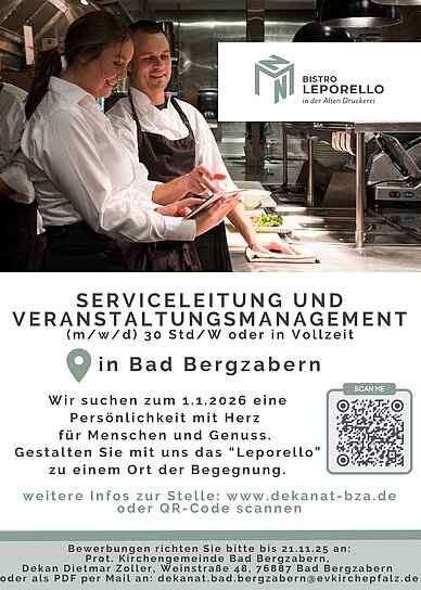 Wir suchen ab dem 1. Januar 2026 eine engagierte Persönlichkeit für die Serviceleitung und das Veranstaltungsmanagement in unserem neu eröffnenden Bistro Leporello in der Alten Druckerei, einem Zentrum für Miteinander und Nachhaltigkeit. Das Bistro soll im Laufe des Jahres 2026 in einen Inklusionsbetrieb überführt werden.
