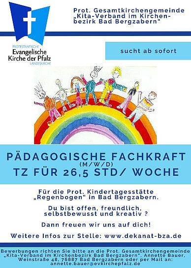 Die Prot. Kita Regenbogen in Bad Bergzabern (Danzigerstraße 17) bietet Platz für 50 Kinder im Alter von 2 bis 6 Jahren in zwei Gruppen. Unsere Betreuungszeiten sind flexibel: